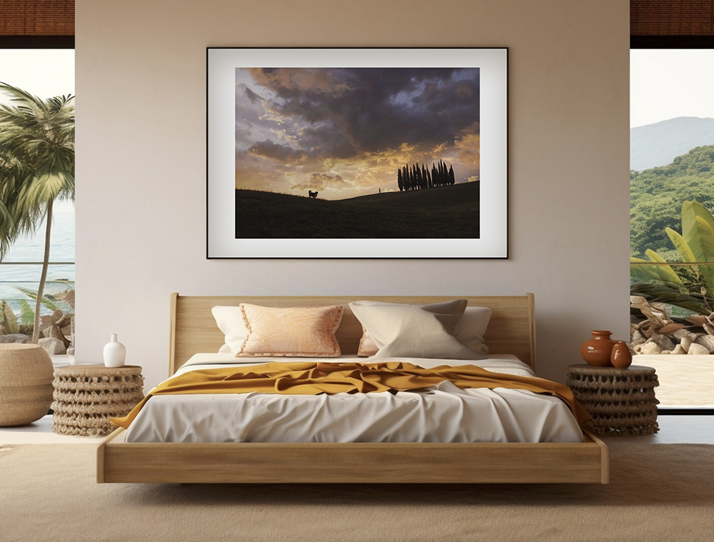 La scena cattura un istante sospeso in Toscana: Mana, in controluce su una collina, di fronte ai cipressi immersi nella luce nascente del sole. Tra cielo drammatico e dolcezza del mattino, questa immagine evoca il respiro del sacro e la magia del luogo.