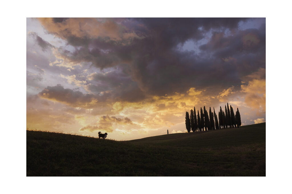 La scène capture un instant suspendu en Toscane : Mana, en ombre chinoise sur une colline, face aux cyprès baignés par la lumière naissante du soleil. Entre ciel dramatique et douceur du matin, cette image évoque le souffle du sacré et la magie des lieux.